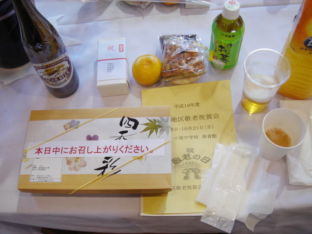 今日のお弁当、紅白まんじゅう、茶菓子、果物