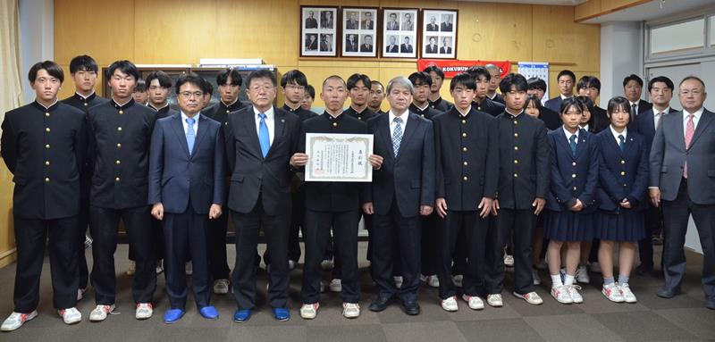 21世紀枠の県推薦校に選出され、表彰状を受け取った国分の伊藤主将(中央)ら