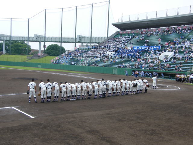 「県野球場。緑の芝が美しい。昔は千葉大会の聖地でもあった。いつもどおりのシートノック。